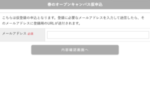- オープンキャンパス開催当日までにメールアドレスを変更される場合は特にお気をつけください。変更した場合でメールアドレスを失念するケースが多発しています。どうしてもメールアドレスなどを思い出せない場合は、一旦全てキャンセルした上で、もう一度仮登録からやり直してください。