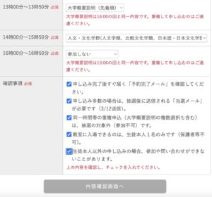 大学概要説明(先着順)の場合や抽選がない場合は、当日「受付完了メール」の画面(あるいは、メールを印刷したもの)を係の者にお見せいただければ受付完了となります。